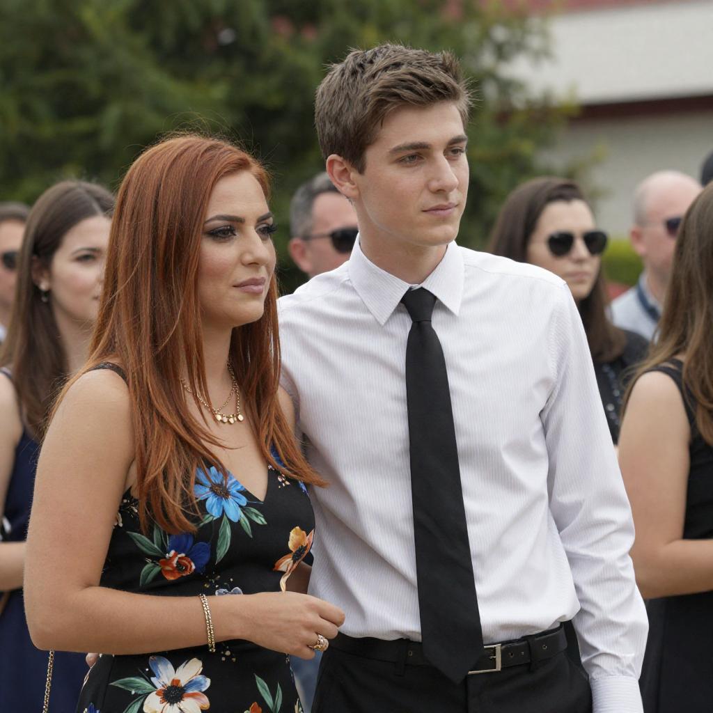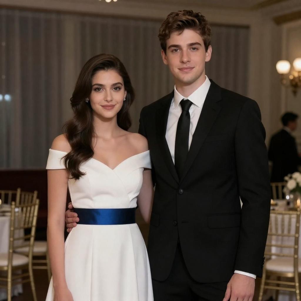 Photograph of a young man with short brown hair, wearing a white pinstripe shirt and black tie, standing beside a woman with long auburn hair, wearing a black and blue floral dress, gold necklace, and bracelets. They are outdoors, surrounded by a group of people, with green trees and a building in the background. The man looks to the right, while the woman looks forward.