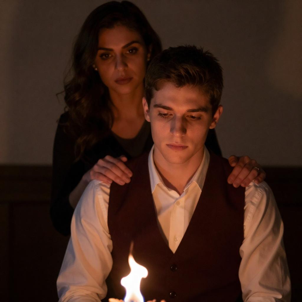 A young man with short brown hair wearing a white pinstripe shirt and black tie stands beside a woman with long auburn hair in a black and blue floral dress. The woman accessorizes with a gold necklace and bracelets. They are outdoors at a social gathering with other people and greenery in the background.