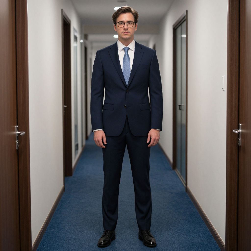 Office Wear Suit Costume, man in a suit standing in a hallway with a blue carpet