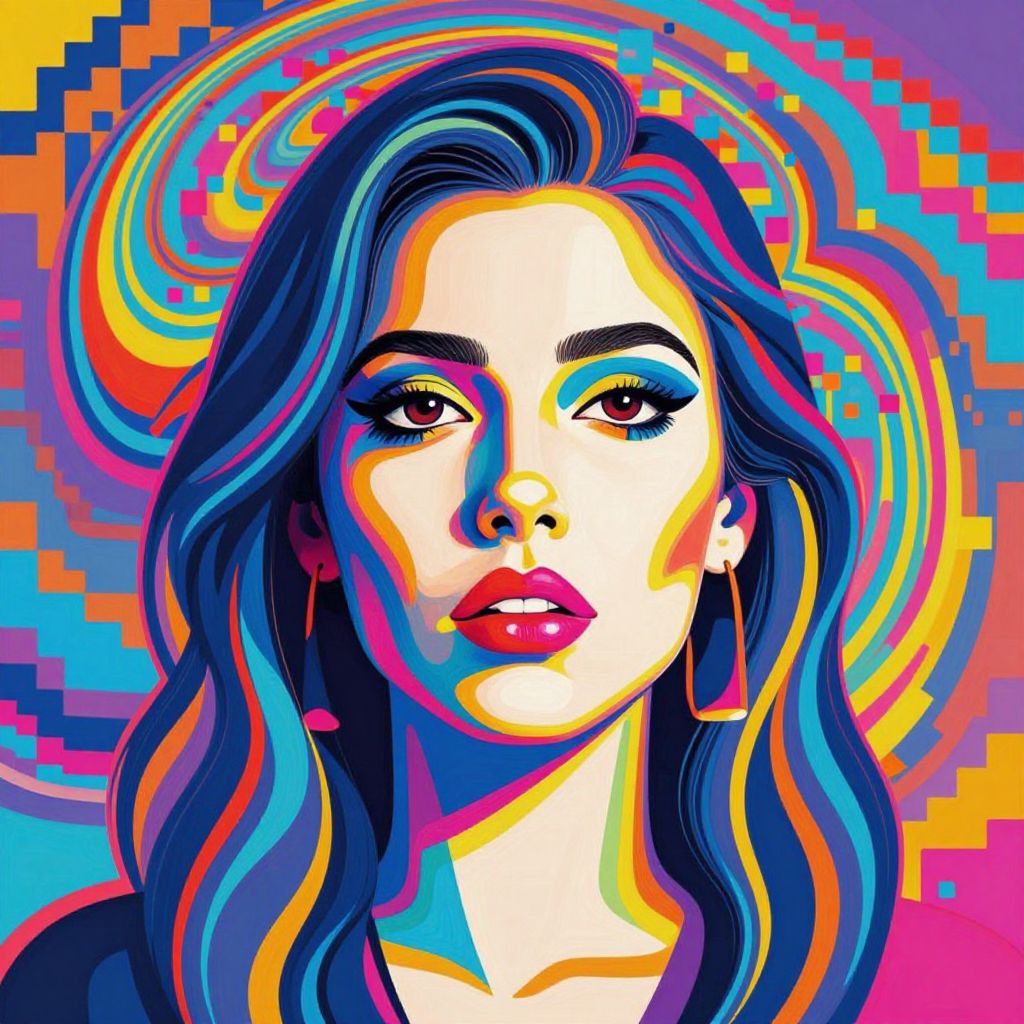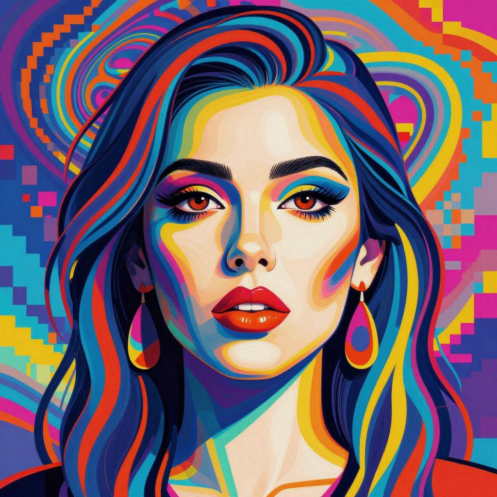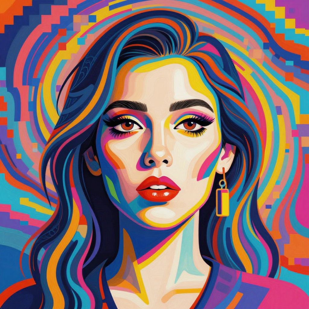 A vividly stylized portrait bursts into life with a kaleidoscope of colors and patterns, where a woman's face is rendered in bold, graphic lines against a swirling, pixelated backdrop that defies conventional realism, creating a surreal and dreamlike visual experience.