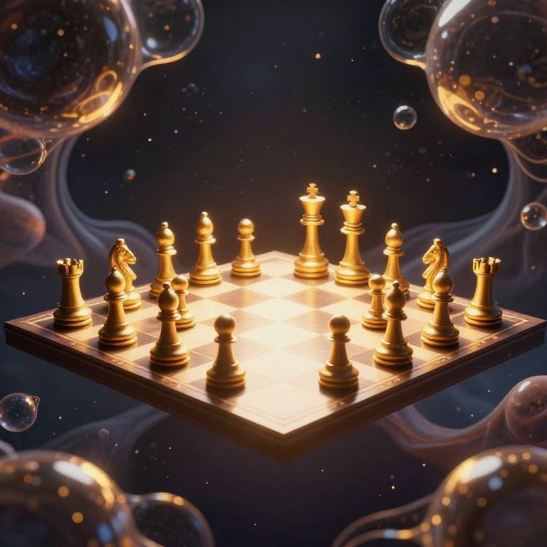 A surreal chessboard floats amidst a cosmic void, its pieces cast in golden light as they stand poised against a backdrop of undulating, bubble-like formations that seem to pulse with an otherworldly energy.