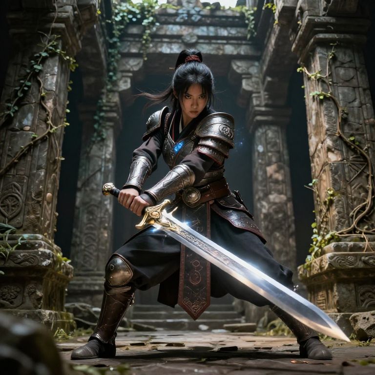Digital artwork of a fierce, young Asian woman with long black hair in a ponytail, wielding a glowing, silver sword. She wears detailed, silver armor with intricate designs and a dark, flowing tunic. Her intense blue eyes are focused forward. She stands in an ancient, ruined temple with overgrown vines on stone pillars. The background is dimly lit, with sunlight filtering through the foliage above. The temple's stone floor is cracked and worn. The image has a high-fantasy, action-adventure style, with realistic textures and dramatic lighting highlighting the character's determined stance and the sword's radiant blade.