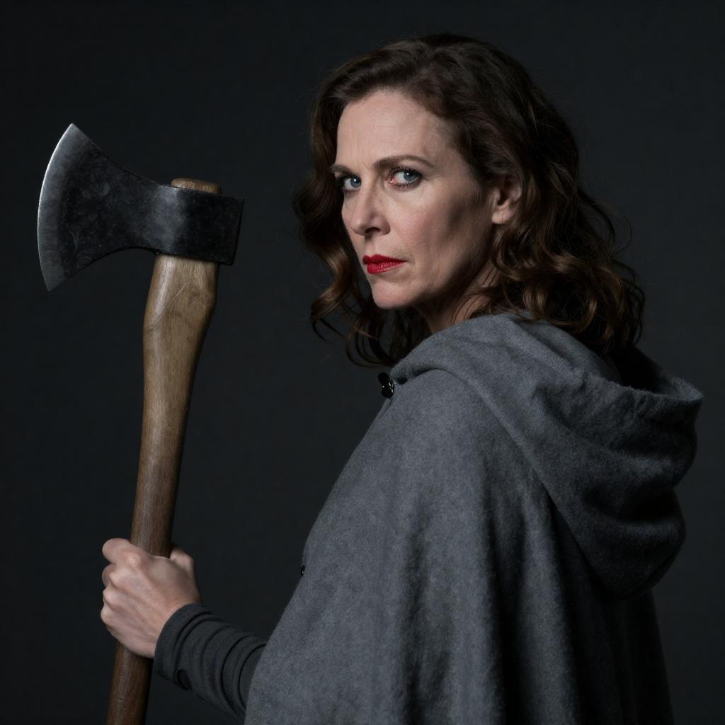 Middle-aged woman with wavy brown hair, wearing a gray cloak, holding a large axe, looking back over her shoulder with an intense expression. Dark, shadowy background. Her red lipstick contrasts with her pale skin. Side profile.