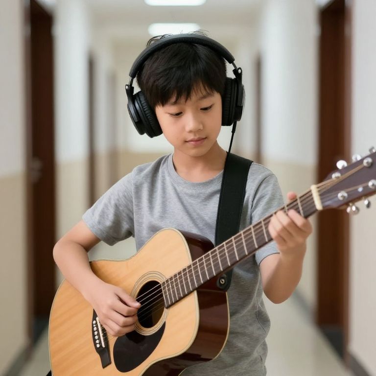 Photograph of an Asian boy with short black hair, wearing black headphones and a gray t-shirt, playing an acoustic guitar in a brightly lit, blurred hallway with white walls and dark brown doors. The boy is focused, with his eyes closed, and has a black strap over his shoulder. The guitar has a light wood body and dark brown fretboard. The hallway's lighting creates a soft, evenly distributed glow, highlighting the boy's concentration and the guitar's smooth texture.