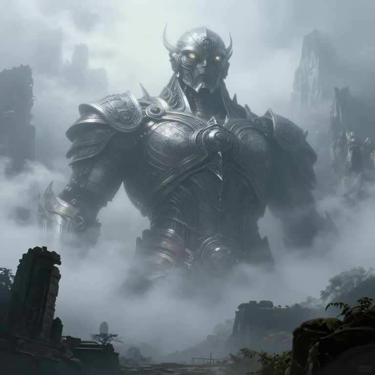 A colossal metallic figure with intricate engravings and enormous glowing eyes emerging from swirling fog in a mountainous landscape. The scene features ancient ruins and a mystical atmosphere, rendered as a digital painting.