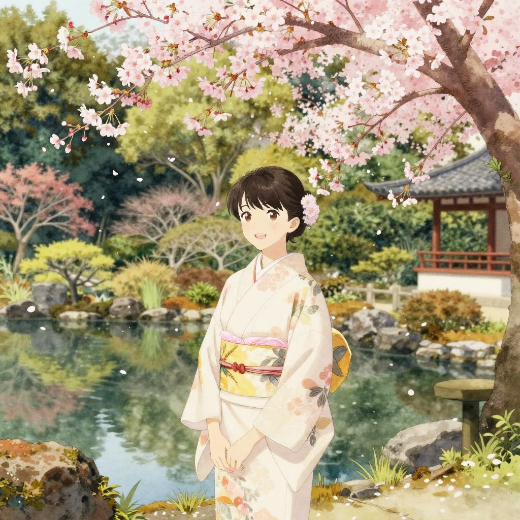 A digital anime-style drawing depicts a young Japanese girl with short black hair and a flower in her hair, wearing a white kimono with subtle floral patterns and a yellow obi. She stands under a cherry blossom tree, surrounded by a tranquil garden with a reflective pond, rocks, and a traditional wooden pavilion in the background. The scene is bathed in soft sunlight, with pink cherry blossoms in full bloom above her. The garden includes various green shrubs and trees, adding to the serene atmosphere. The girl has a gentle smile and a relaxed posture.