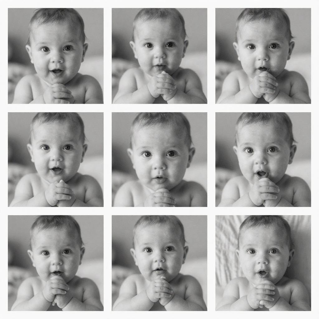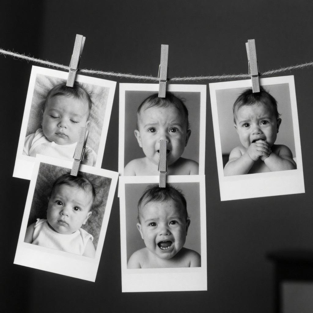 This is a black-and-white photograph showing four baby photos clipped to a string with clothespins against a dark, textured background. The photos feature different baby expressions: sleeping, looking up, crying, and holding a foot. The camera angle is top-down, with a shallow depth of field that keeps the photos in focus while the background is slightly blurred. Lighting is soft, creating gentle shadows.