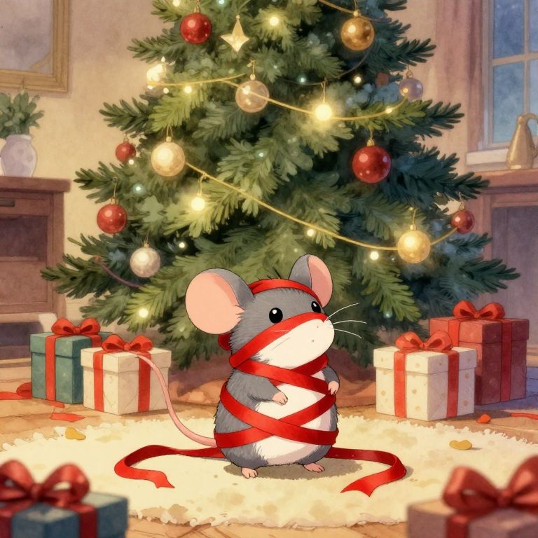 Art style: anime style, watercolor backgrounds, Dreamlike wonders, spirited characters, imaginative fantasy worlds, Fantasy, but realistic, Description: In the center of the scene is a super cute deer sitting on a yoga mat and doing Yoga in a Lotus Meditation, Background: The scene takes place in a beautiful living room, A large decorated Christmas tree, Many wrapped presents of various sizes with red ribbons are scattered around the tree, The lighting is dim, The scene is super funny and freaky and at the same time