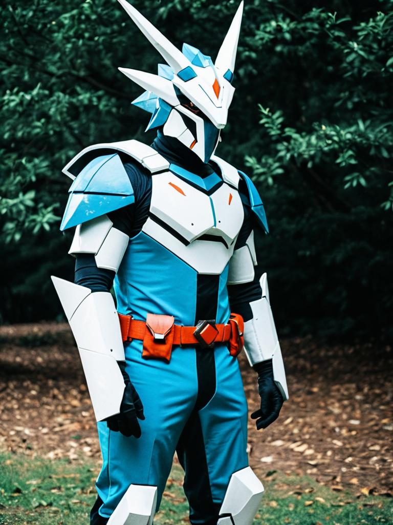 A man dressed in a detailed and realistic Cobalion cosplay costume, featuring a blue jumpsuit with black and white armor accents, yellow eyes on the helmet, and a tail. The setting is an outdoor grassy field with trees in the background.