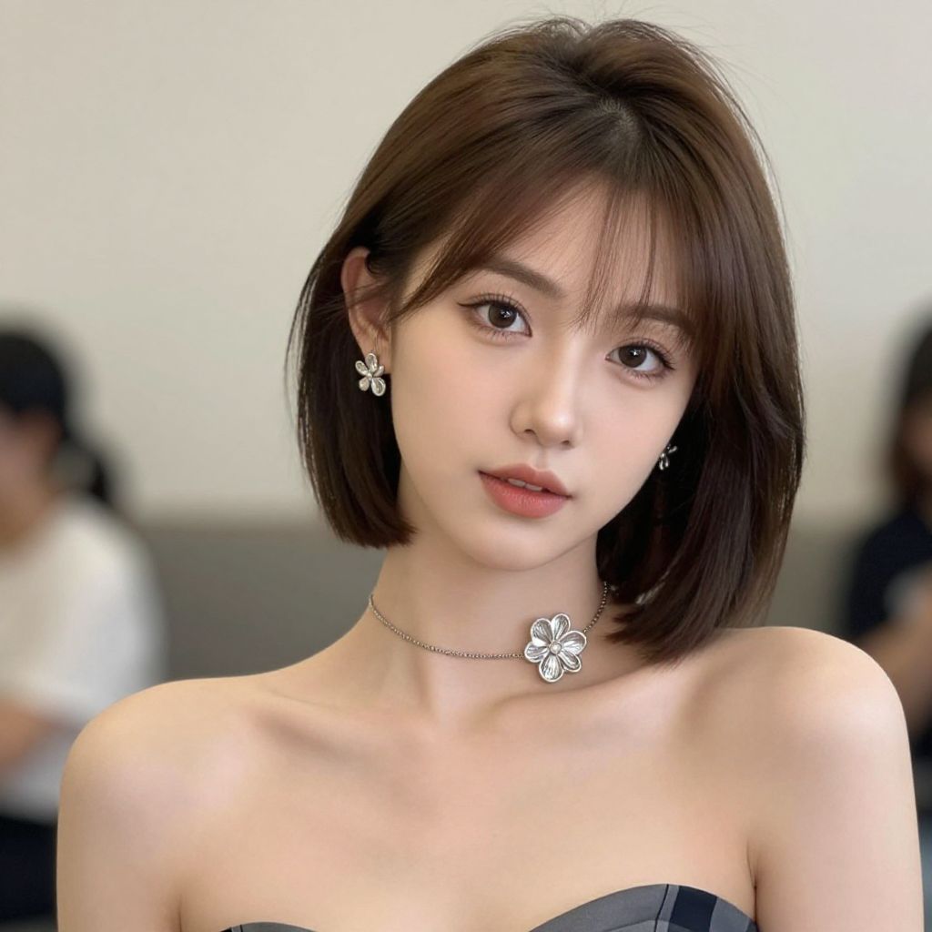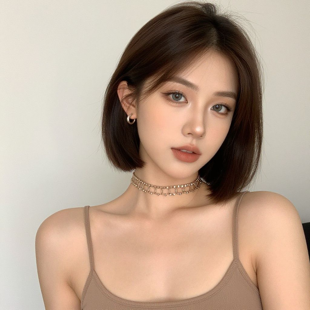 "front bob cut hairstyle, 1girl, solo, jewelry, breasts, necklace, cleavage, brown hair, looking at viewer, short hair, realistic, earrings, bob cut, choker, camisole, medium breasts, green eyes, makeup, lips, spaghetti strap, upper body Realistic photo of casual sexy person with pretty face"