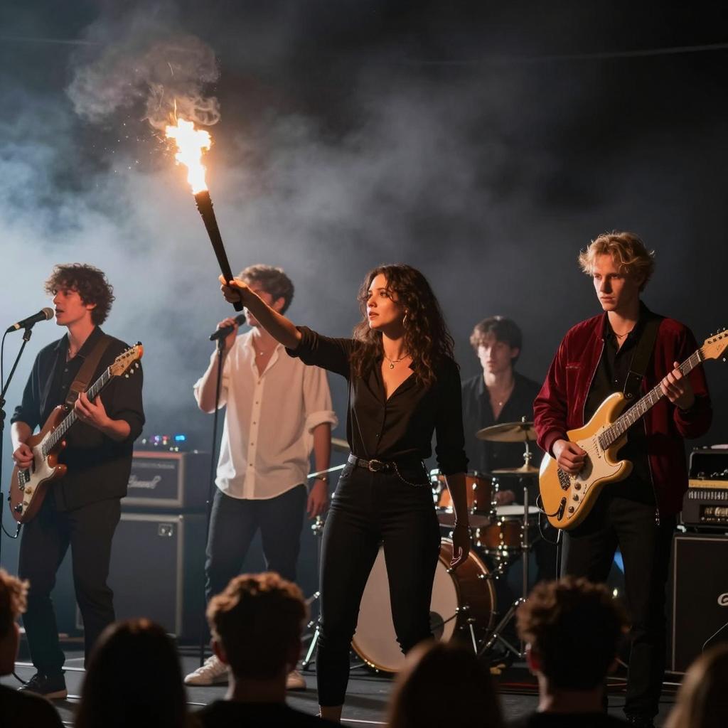 Two women dancing on stage, arms raised. Left woman wears black leather hat, red leather crop top, black leather pants. Right woman wears red crop top, black studded pants. Background with colorful lights and posters. Second woman in the background with arms raised. Three people total. Bright stage lights. Mid-1980s fashion.