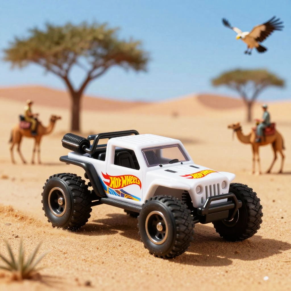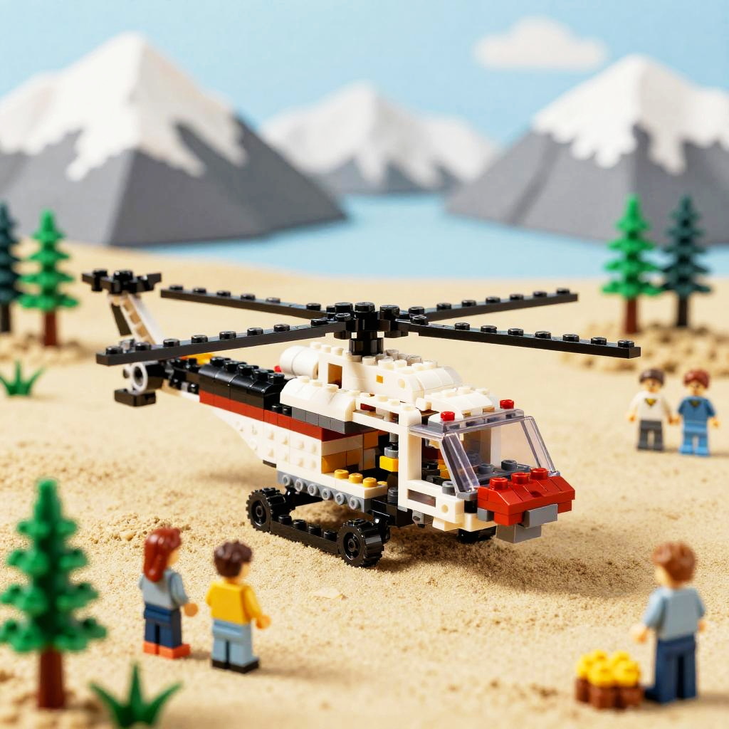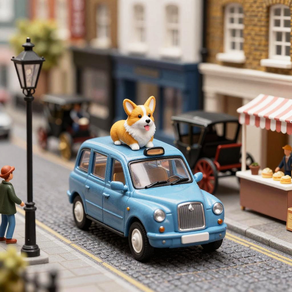 Artwork macro shot of a miniature Corgi Classic Double Decker Bus set in the Historical Dublin with scenery including sand, mountains, trees, kids, and adults, in a 16-bit color palette.