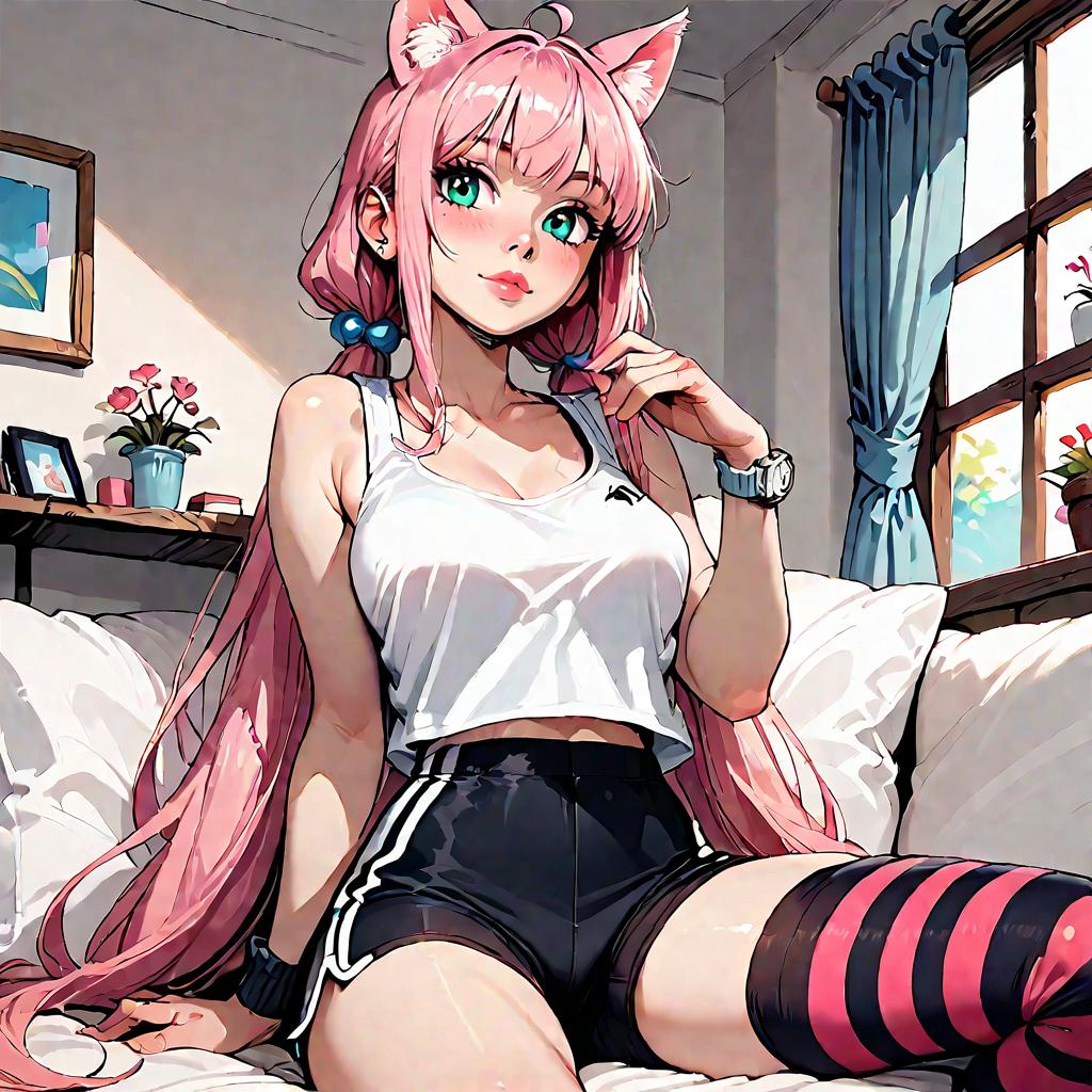 Score_9, score_6_up, source_anime, 1girl, solo, living room, okayu_base, black hoodie, onigiri print, midriff, white pants, animal collar, cat tail, ahoge, :\3, paw pose