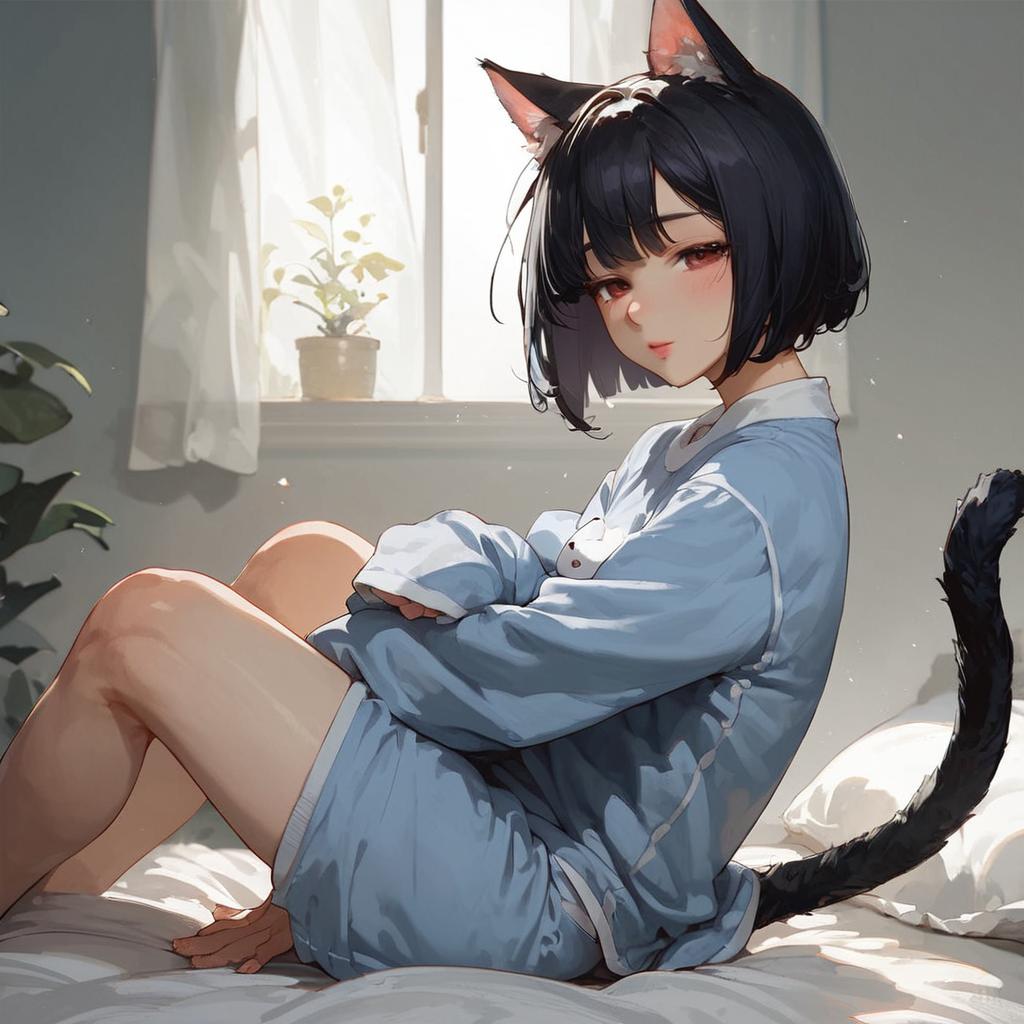 Digital artwork of an anime-style girl with short black hair and amber eyes wearing a black cropped hoodie featuring a cute cat print, white pants, a red animal collar with a bell, and cat ears and tail. She is posing with her hands in a paw gesture in a bright living room setting with plants, colorful cushions, and framed cat pictures on the wall.