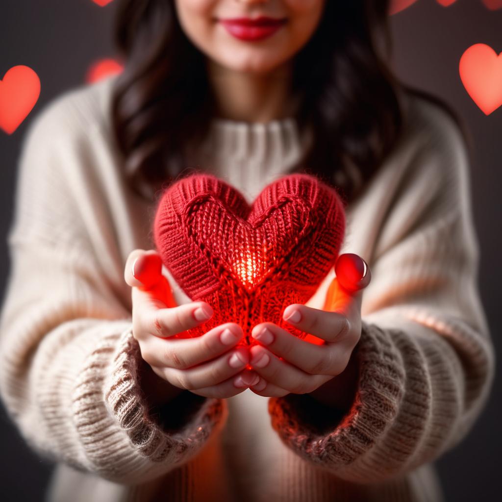 A person wearing a beige knitted sweater gently holding a glowing red heart-shaped object in their cupped hands, with soft warm lights and bokeh in the blurred background, creating a cozy and intimate atmosphere, soft focus and gentle lighting emphasizing warmth and tenderness.