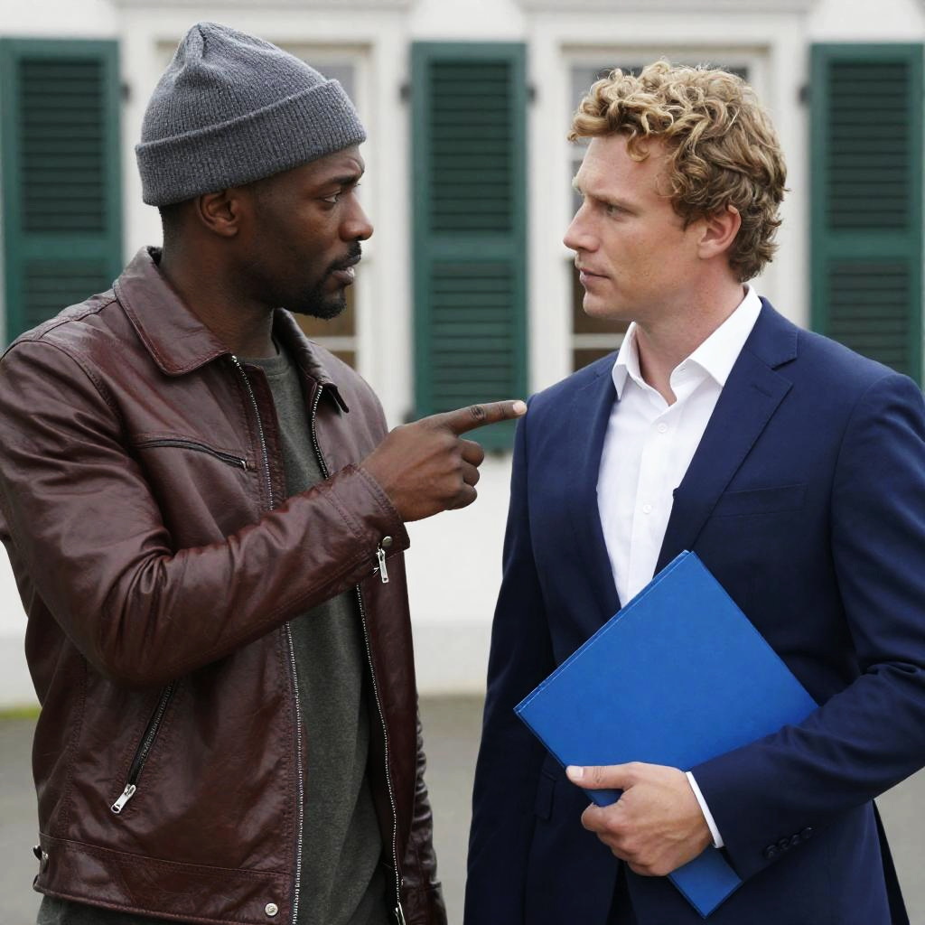 Photograph of two men in suits. Dark-skinned man with bald head, gray suit, and patterned tie gestures to fair-skinned man with red hair, black suit, and white shirt. Fair-skinned man holds phone to ear, looking serious. Background: metal shutter with red and black graffiti. Dark-skinned man smiles, fair-skinned man looks focused.