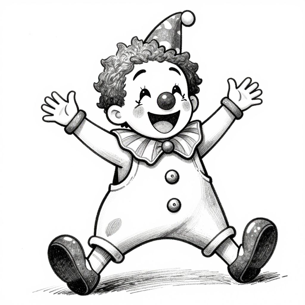 Vivid black and white illustration, black ink, pen, childrens storybook drawing, very happy clown, excited,