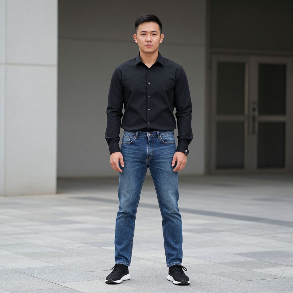 Photograph of a young Asian man with short black hair, wearing a black button-up shirt, blue jeans, and black sneakers, standing in a modern