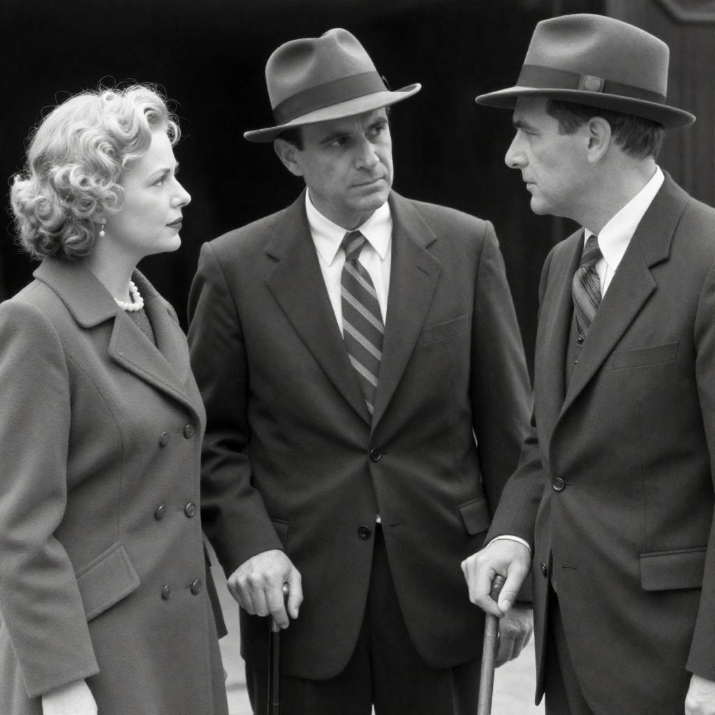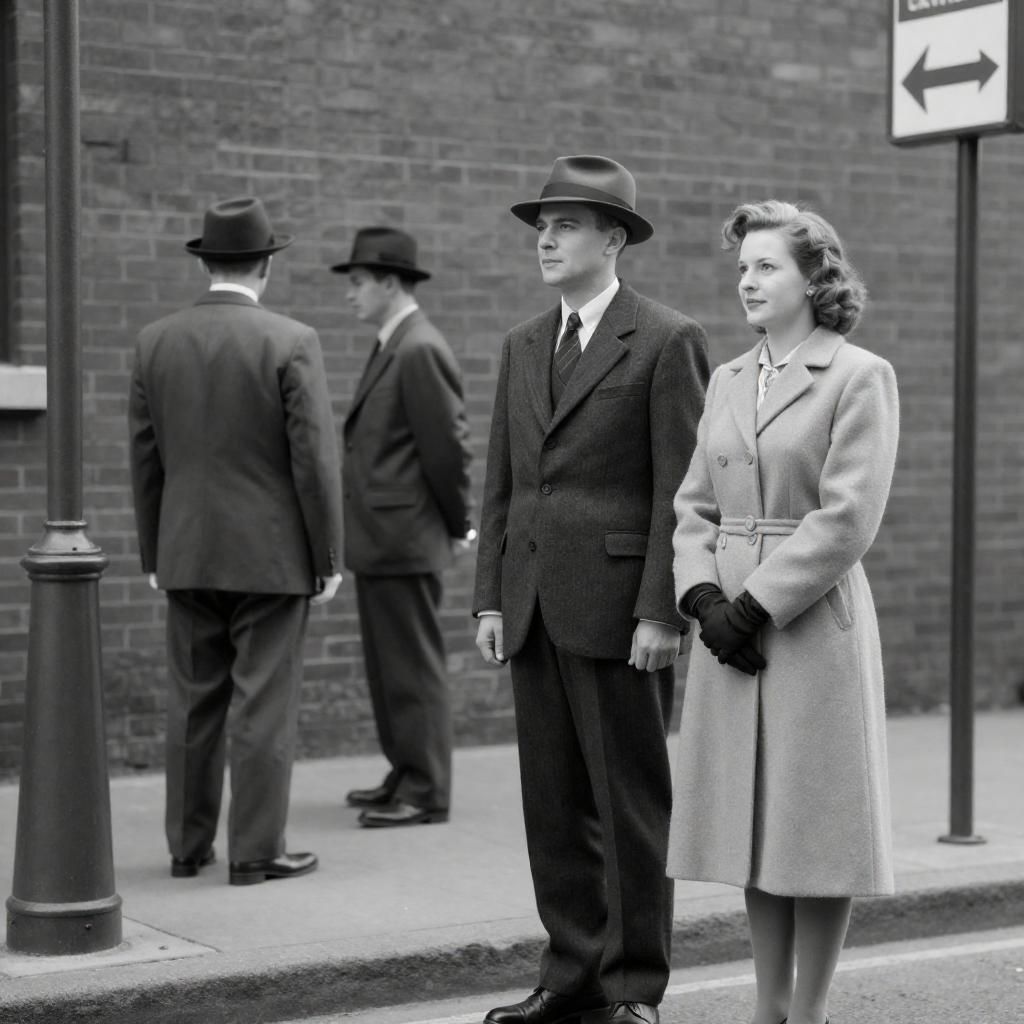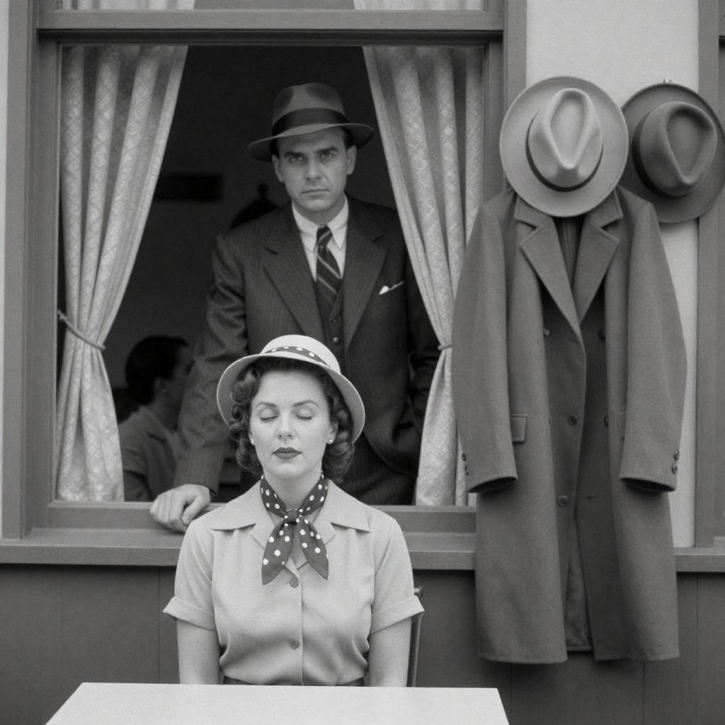 Black and white photograph of a 1940s-style café. A man in a hat stands in a window with patterned curtains, looking serious. In the foreground, a woman with a polka dot scarf and hat, eyes closed, sits at a table. Two hats and a coat hang on the right. A third person is partially visible in the background.