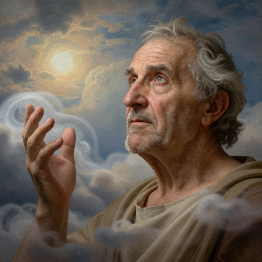 Photorealistic digital artwork of an elderly man with gray, curly hair and a weathered face, gazing upward at a bright, glowing sun partially obscured by clouds. He wears a simple, beige tunic and holds his right hand up, with swirling white energy emanating from his fingers. His expression is contemplative and serene. The background features a dramatic, cloud-filled sky in shades of blue and gray, enhancing the mystical and ethereal atmosphere. The man's skin is textured, showing wrinkles and age, and the overall style blends realism with a touch of fantasy.