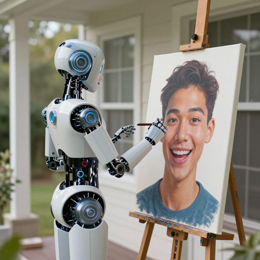 Angora robot AI standing on back porch, painting a happy human face on a canvas, futuristic, realistic, 4k,
