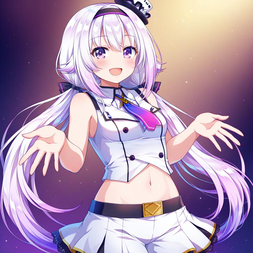 Carro pino, .live, 1girl, purple eyes, hair between eyes, purple hair, long hair, low twintails, small breasts, navel, virtual youtuber, virtual youtuber, headband, by artist kaoling, illustrious