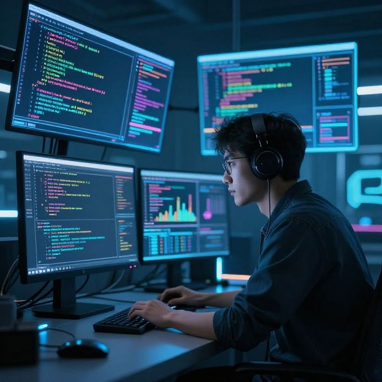 Photograph of an Asian male programmer with short black hair and glasses, wearing a dark, long-sleeve shirt and black headphones, focused on multiple computer monitors displaying colorful code and graph interfaces. The room is dimly lit with a blue hue, and additional screens are mounted on the wall behind him. He is seated at a desk with a keyboard and mouse, typing intently. The scene conveys a high-tech, modern workspace with a focus on coding and development.
