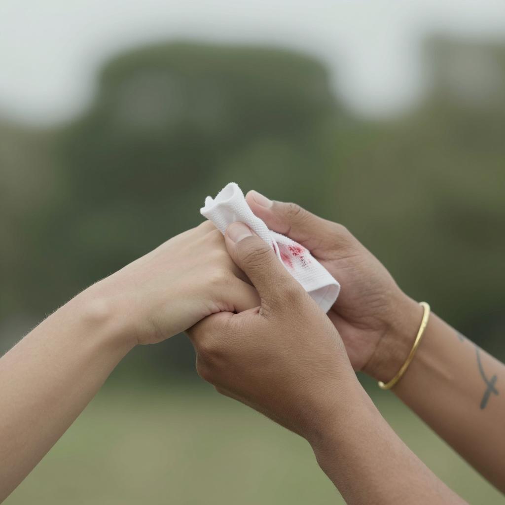 Close-up of two hands. Right hand with tan skin, wearing gold bracelet, gently holding left hand with lighter skin, bloodstained white cloth. Background: blurry outdoor scene with green trees and overcast sky. Two hands, one arm tattoo visible.