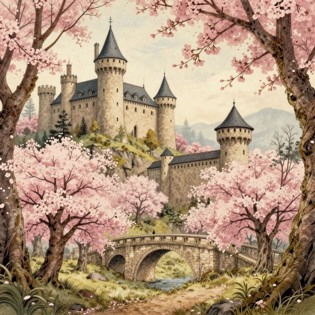 Fragmentation Yoji Shinkawa drawing of an ost moving towards a dark eerie castle on a hill in a vibrant landscape,
