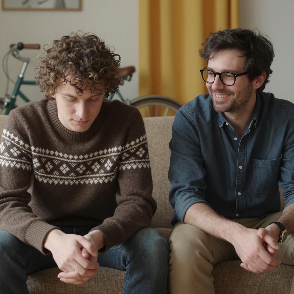 Four men in a cluttered room. One man with arms raised wears a tie-dye shirt, others wear red, orange, and green shirts. Background includes posters, a green cabinet, and a bed. Man on right is bald. Man in orange shirt looks at raised arms. Man in red shirt looks at orange shirt man. Man in green shirt looks down. Bright colors, casual clothing.