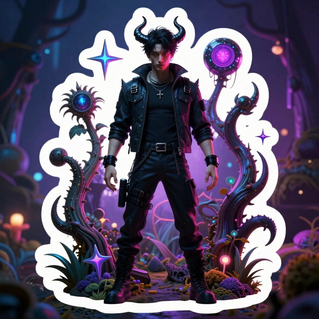 Realistic photo.Die cut sticker. beautiful male sprite, magical garden, demonic, vaporwave, retro, neon, aesthetic, high quality, high definition, beautiful, dramatic lighting realistic photo
