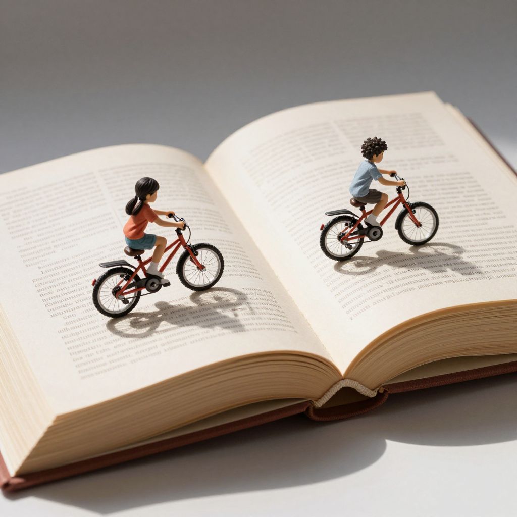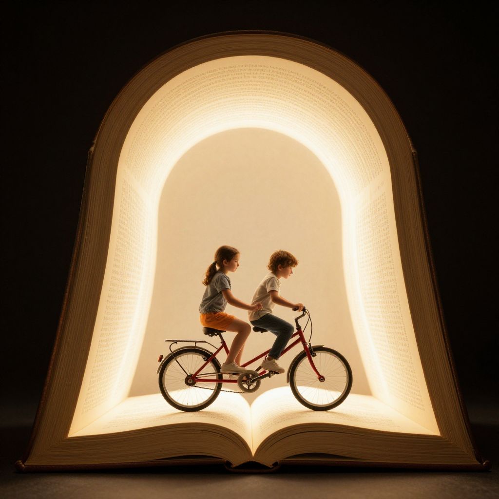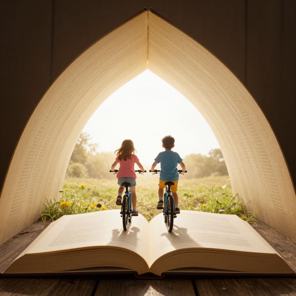 Through the radiant arch of an open book, two children pedal into the luminous unknown, weaving stories of boundless imagination and the exhilarating freedom of discovery.
