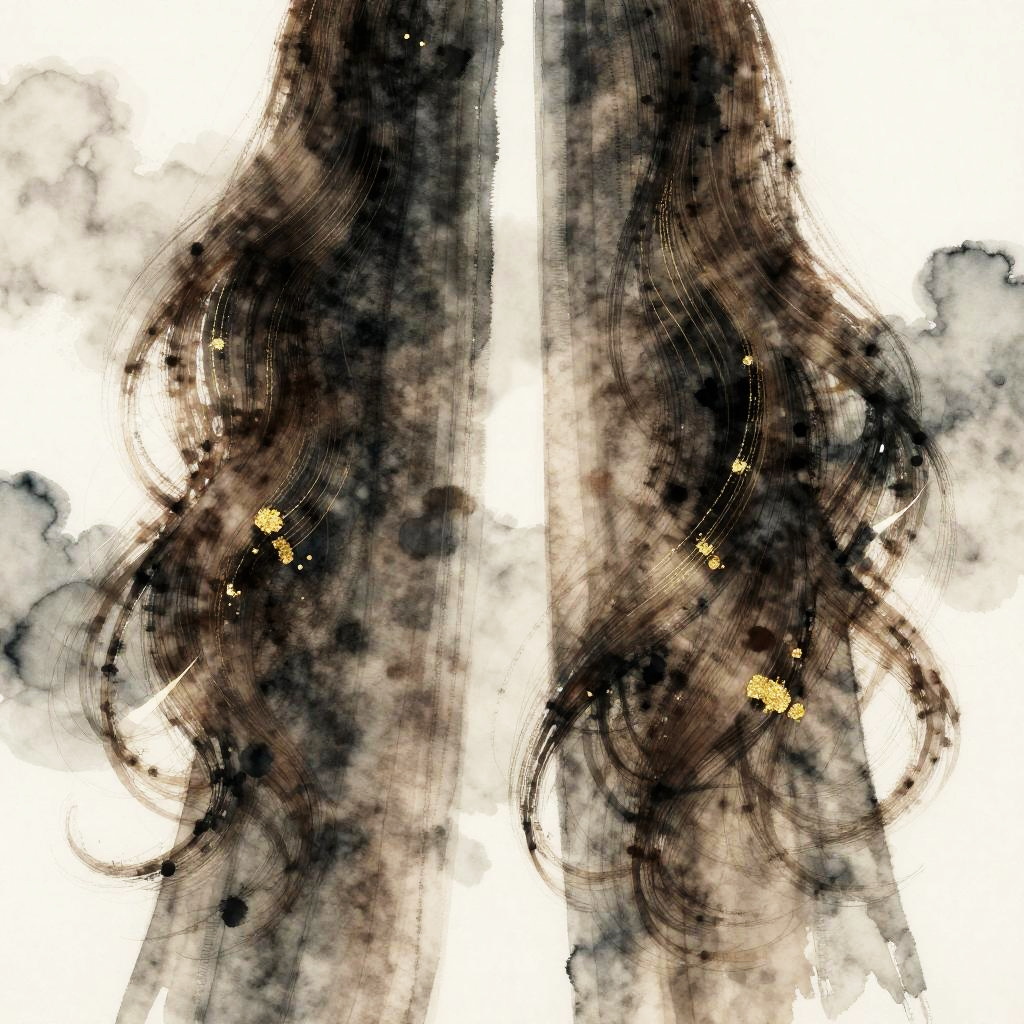 Abstract digital art of long, wavy brown hair with black and gray splatters, set against a white background. Yellow highlights accentuate hair curls.