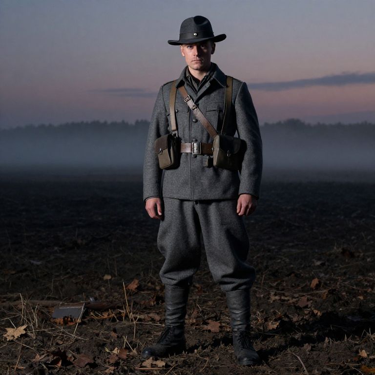 Photograph of a middle-aged Caucasian man standing in a dark, misty field at twilight. He wears a dark gray, woolen military-style uniform with a black hat, black boots, and brown leather straps with pouches across his chest. His face is pale, with a serious expression, and he looks directly at the camera. The background features a foggy horizon with a gradient sky from purple to blue. The ground is barren with scattered dry leaves and twigs. The lighting emphasizes the man's figure, casting shadows on the ground.