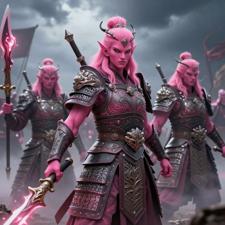 Pink skinned characters depicted as mythical warriors in an ancient, misty battlefield, wearing ornate armor with intricate engravings, holding glowing weapons, intense and heroic expressions, dramatic lighting emphasizing their vibrant pink skin tone amidst stormy skies.