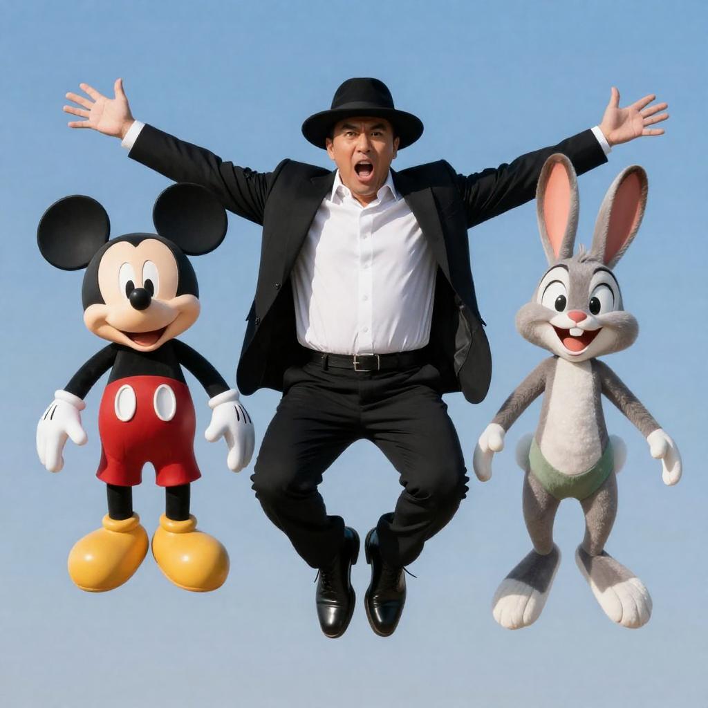 Photograph of a man in a black suit and hat, blue gloves, white shirt, and red tie, standing next to a tall, red, nude woman with white rabbit ears, blue gloves, and yellow shoes. A white rabbit with red ears, yellow shoes, and blue bow tie stands between them, smiling. Teal ured background. The man points to the right. The woman looks up.