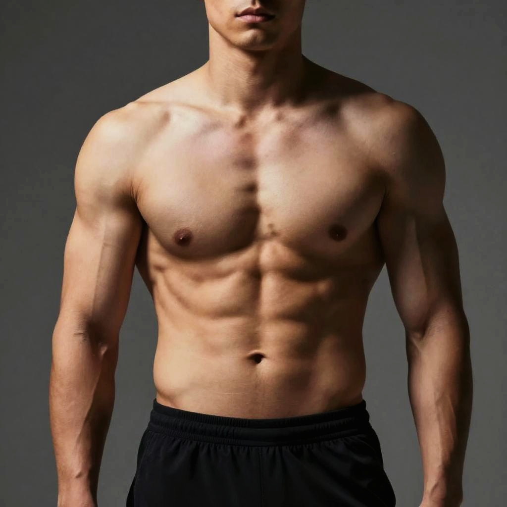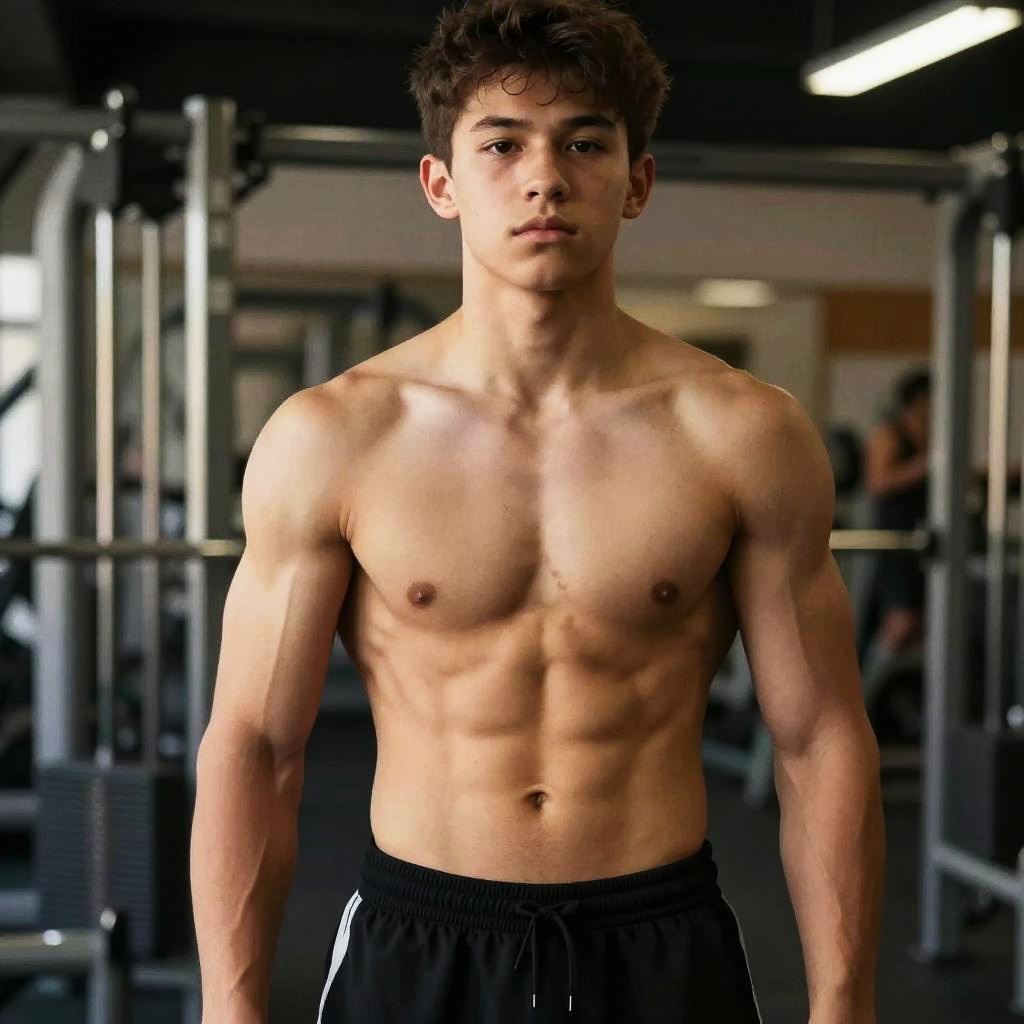Teen pecs, a young athletic teenager with well-defined pectoral muscles, standing confidently in a gym setting, warm natural lighting highlighting muscle tone, detailed anatomy, sportswear, dynamic and inspiring atmosphere
