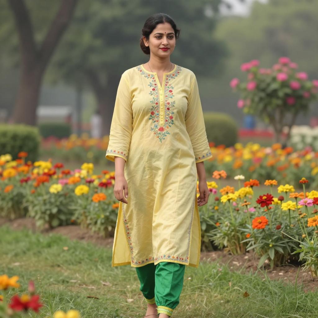 Dance exercise costume, photograph of a smiling woman, brown hair in bun, traditional Indian dance outfit, orange long-sleeve kurta with red and black accents, black loose pants, barefoot, standing on wooden floor, natural light from large window on right, indoor setting, potted plant in background, daytime, relaxed pose, right hand on hip, left hand raised slightly, soft shadows, minimalistic decor, traditional attire, cultural dance, casual atmosphere