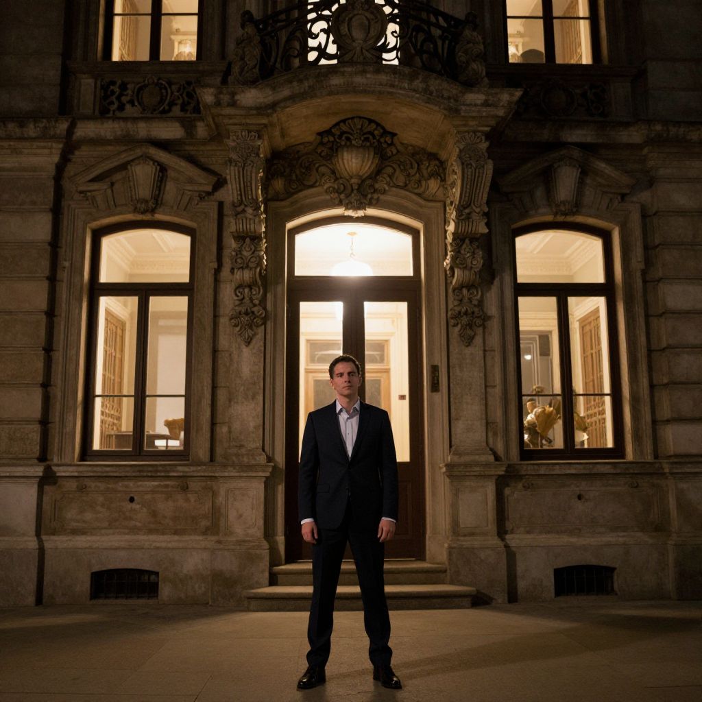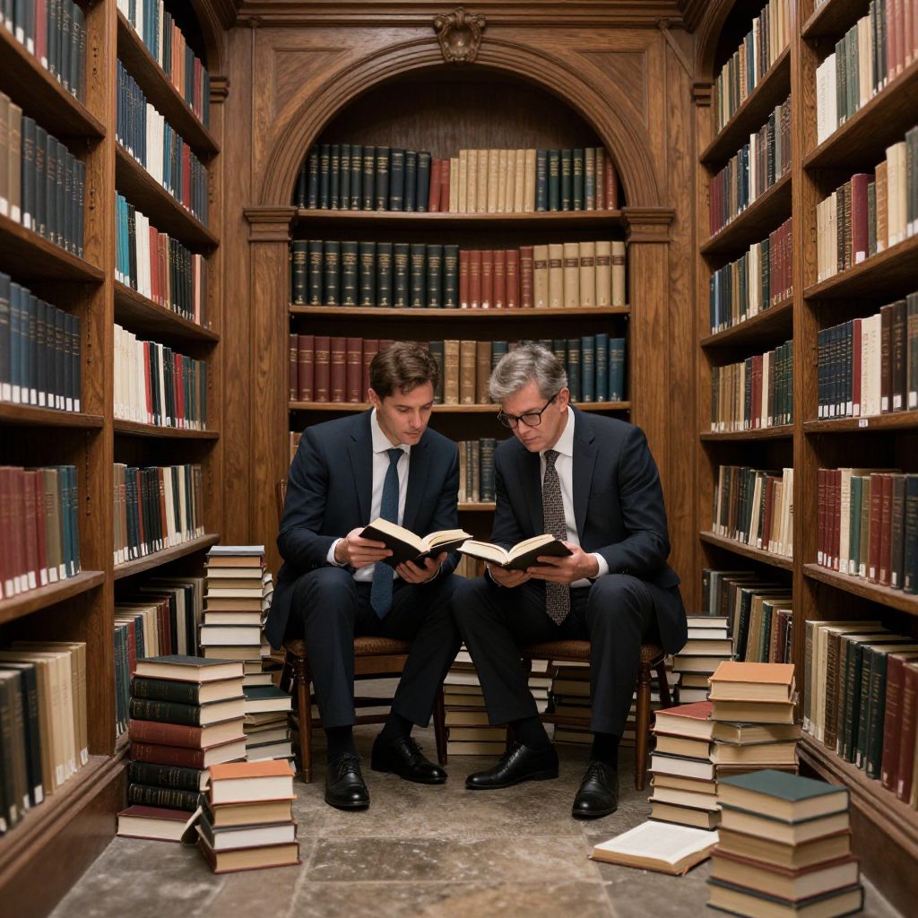 Two men in suits study open books amidst a grand, arched library filled with wooden shelves lined with leather-bound volumes, while scattered stacks of books lie strewn across the stone floor beneath them.