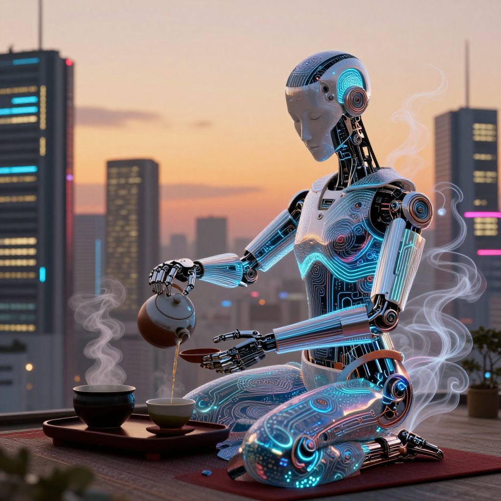 Digital art of a glowing, blue-neon humanoid robot pouring tea on a rooftop, cityscape with sunset, steam rising, cups on a red mat
