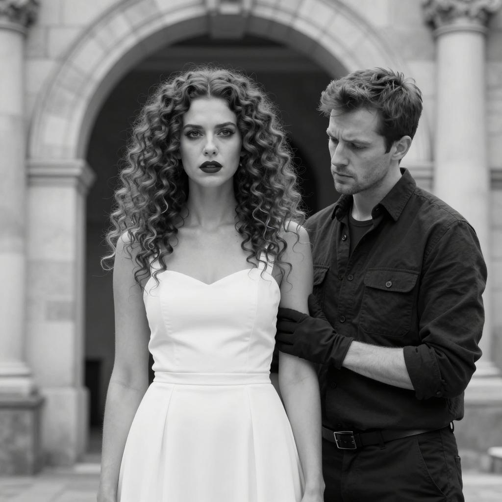 Black and white portrait of a serious family indoors. A woman with wavy hair wearing a plaid dress stands in front with her hand on her chest, showing an intense expression. A man with curly hair in a suit and white shirt stands beside her, looking serious. Two children, a boy and a girl, are blurred in the background near a window. The background is dark, emphasizing the expressions and details of the subjects' faces.