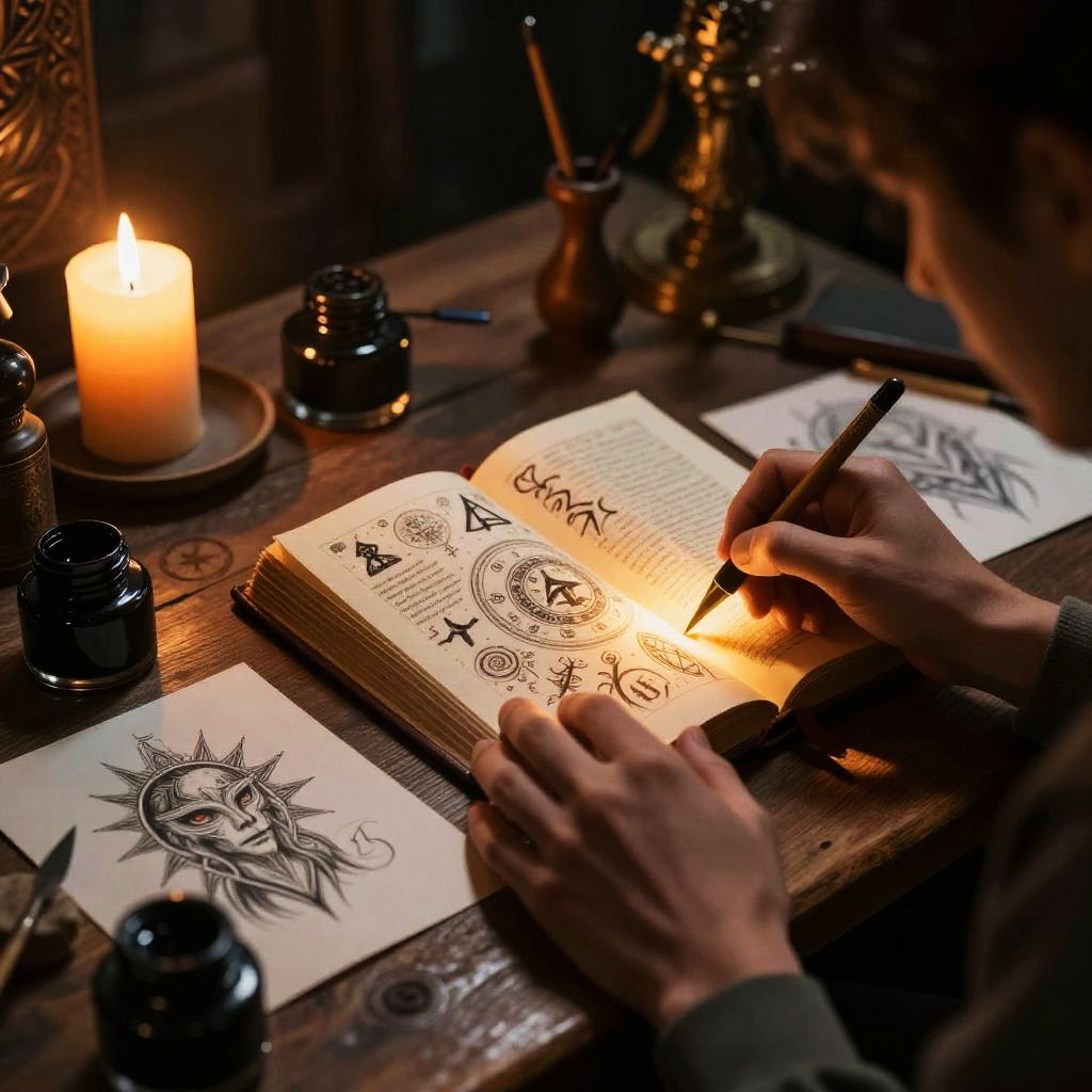 Tattoo prompt generator in a mystical ancient workshop, wooden desk scattered with ink pots and tattoo sketches, warm candlelight casting shadows, a magical book glowing with symbols, fantasy art style, richly detailed, atmospheric scene