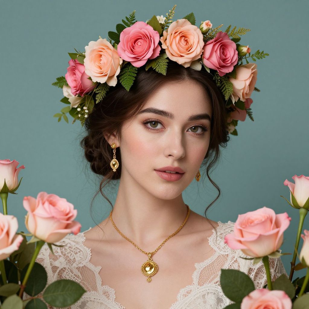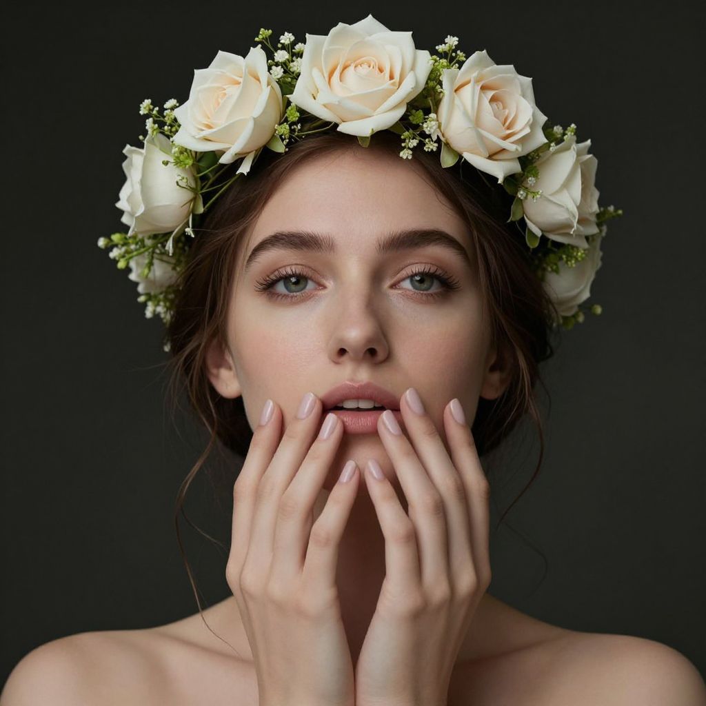 Elegant hands gently touch lips as a woman adorned with a delicate crown of six cream-colored roses and small green accents gazes upward, her expression serene against a dark, moody backdrop.