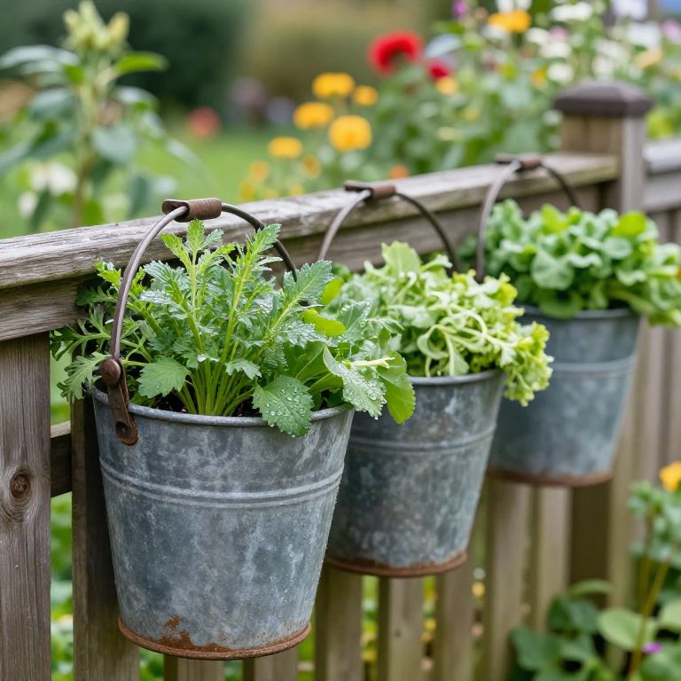 Close-up of weathered buckets hanging on a wooden fence in a lush garden, each bucket packed with freshly picked herbs and vegetables, morning dew glistening on leaves, soft focus on the background full of greenery and colorful blooms.