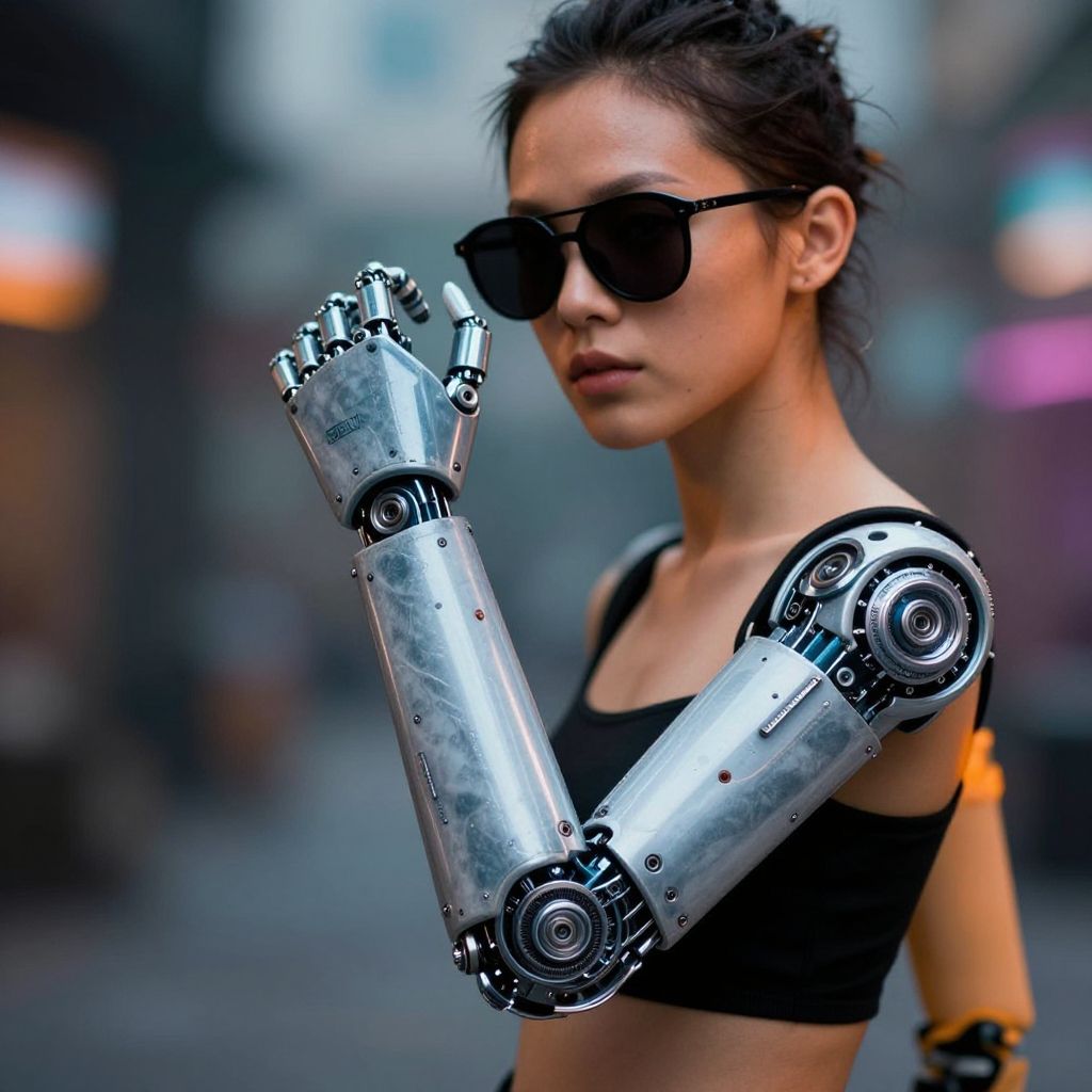 Photograph of a young woman with light brown skin and dark hair tied back, wearing black sunglasses and a black sports bra. She has a cybernetic left arm with shiny, metallic, segmented joints and visible gears, raised slightly. The background is a blurred urban street with colorful lights. The image has a sci-fi, futuristic theme, highlighting the contrast between her natural appearance and the advanced technology of her arm. The lighting emphasizes the metallic texture of the cybernetic arm.