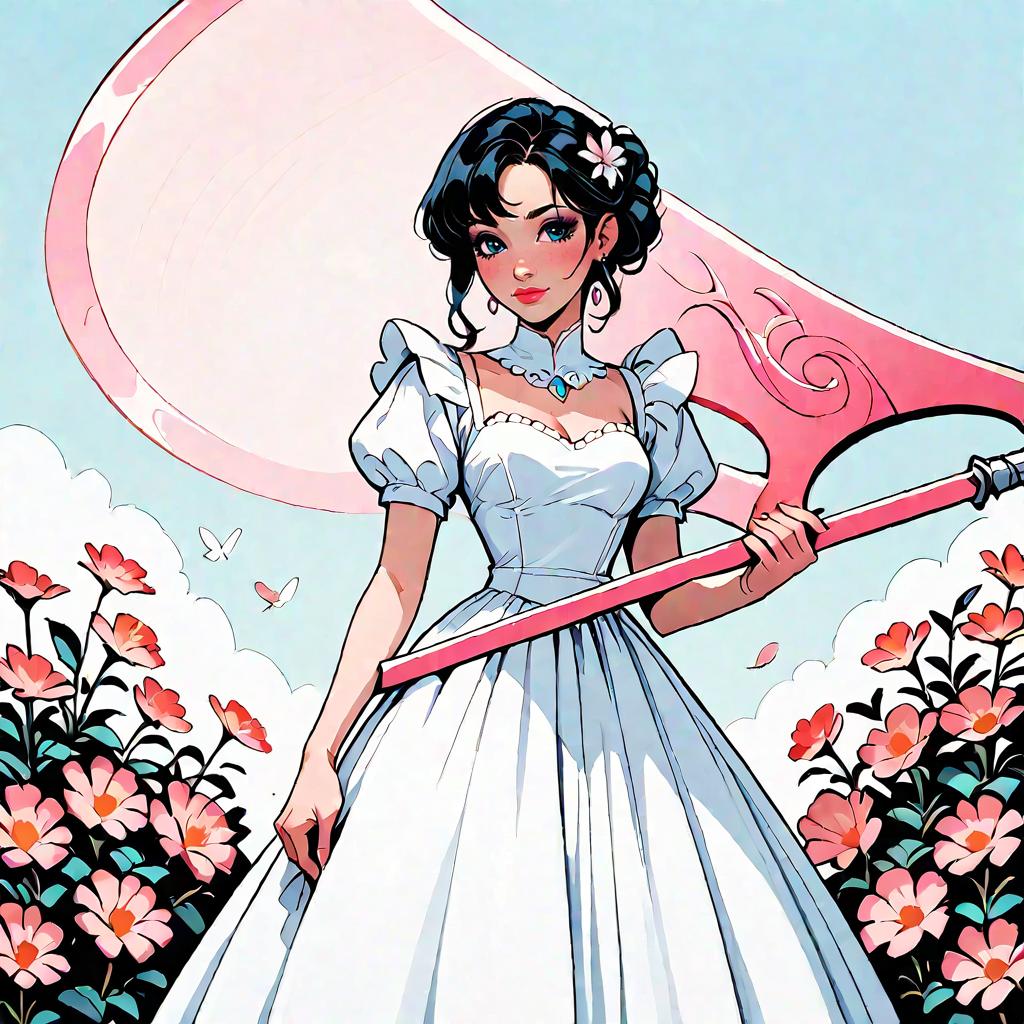 Score_9, score_8_up, score_7_up, score_6_up, score_5_up, score_4_up, (1 cute princess, beautifull dress, standing in a flower garden, holding a pink scythe:1.2), flowers in background