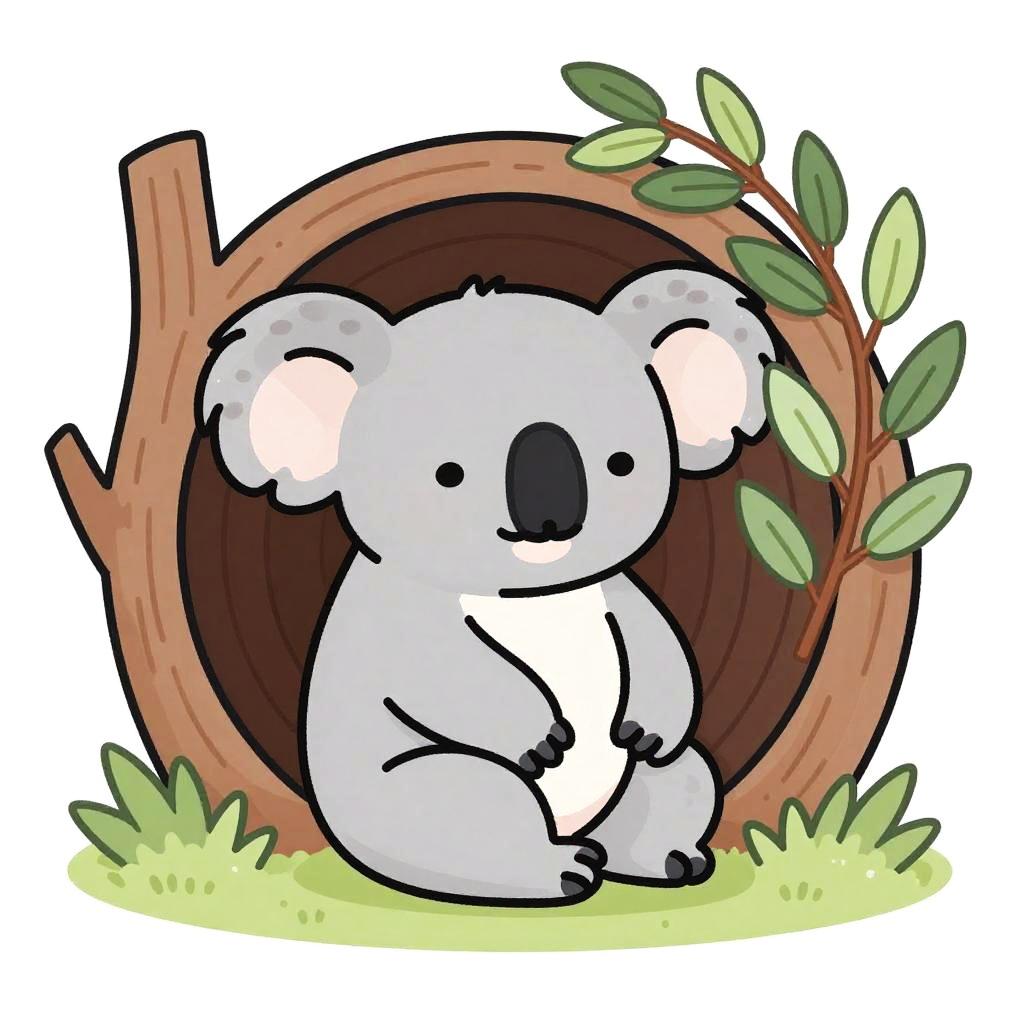 A sleepy koala with a serene contented smile sitting by a eucalyptus tree hollow. Utilize simple shapes to create a coloring-friendly illustration, emphasizing the gentle and dreamy disposition.