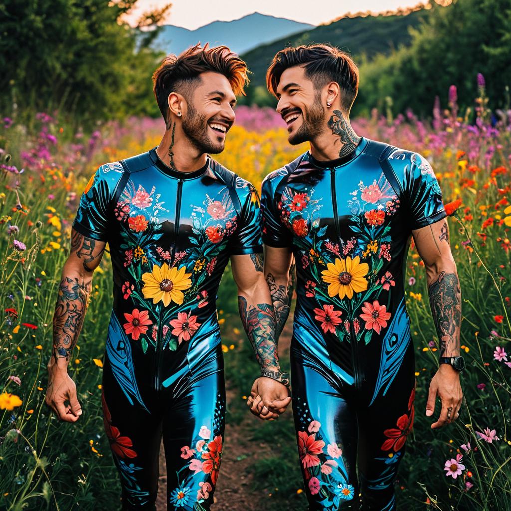 Two handsome men with brown hair and intricate tattoos hold hands and smile at each other while standing on a path surrounded by vibrant wildflowers. They wear matching reflective PVC bodysuits adorned with colorful floral designs. The background includes green trees and distant mountains.