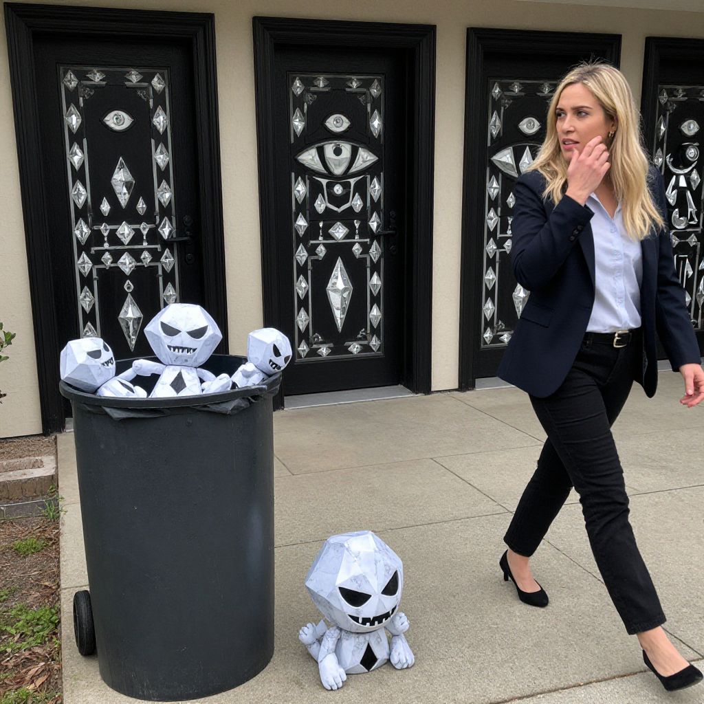 So, the little dog-man turned into a strange diamond-shaped doll with a menacing face, I quickly collected them again and for some reason decided to take them to the trash, Brilliant idea, A familiar woman was walking nearby, apparently tipsy judging by the tone of her conversation, While I was throwing these screaming Satan into the container, this woman was talking some nonsense in my ear, apparently about her work, Then behind me on the second trash site, doors began to appear, just doors with a strange pattern resembling an eye and many diamonds around it