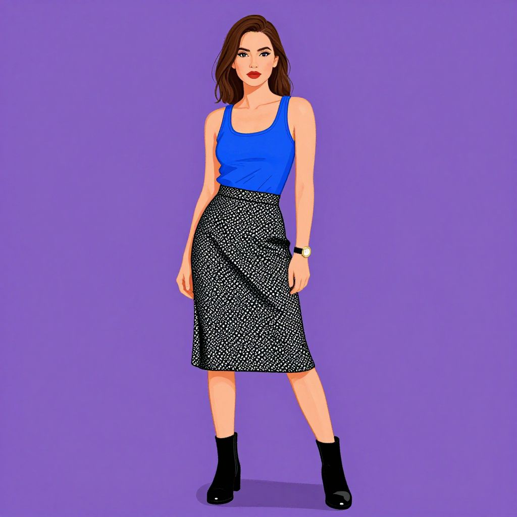 Digital drawing of a stylish woman with fair skin and shoulder-length brown hair. She's wearing a bright blue tank top, a black and white patterned knee-length skirt, and black ankle boots. Her makeup is subtle, with red lipstick. She stands confidently against a solid purple background. She's accessorized with a gold watch on her left wrist. The art style is vibrant and cartoonish.